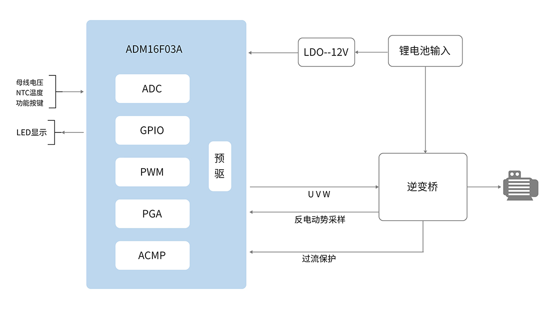 高度集成化方案,內(nèi)置5V LDO及6NMOS預驅(qū),節(jié)省板型空間及成本;反轉(zhuǎn)自停、正轉(zhuǎn)扭力調(diào)節(jié),啟動速度快,無極調(diào)速,調(diào)速平穩(wěn)。