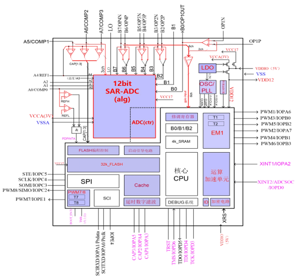進(jìn)芯電子近期推出的ADP16F03是面向無(wú)刷電機(jī)控制的16位DSP最新改進(jìn)型號(hào),產(chǎn)品搭載了100M主頻16位DSP處理核+加速運(yùn)算單元,具備事件管理器、SPI和SCI模塊和12位ADC,并集成運(yùn)算放大器、電壓比較器和溫度傳感器,可構(gòu)成控制核心,支持有感、無(wú)感、方波、弦波等多模式無(wú)刷電機(jī)控制。