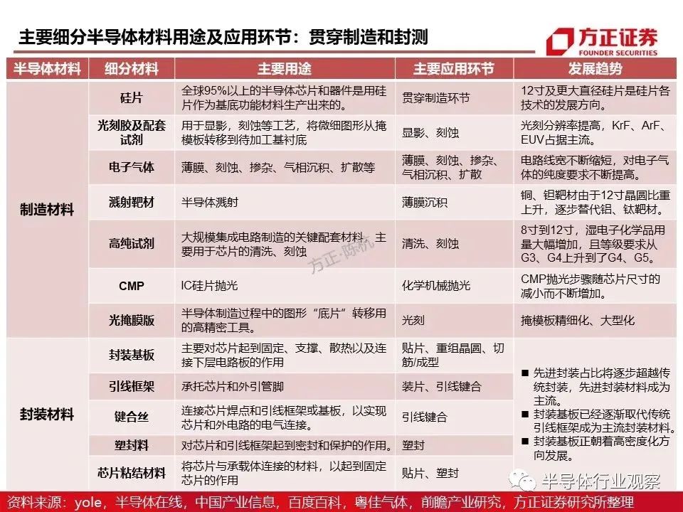 在晶圓制造工藝中,主要用料為硅片、靶材、拋光材料、光刻膠、高純化學(xué)試劑、電子特氣和化合物半導(dǎo)體,其中,硅片、電子特氣、光掩膜版、拋光材料等用量較大;在封裝測試中,主要材料為封裝基板、引線框架、陶瓷封裝體和鍵合金屬線,其中,封裝基板、鍵合絲等是較為主要的材料。