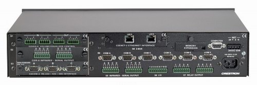 快思聰2-系列旗艦產品PRO2用于滿足大中規(guī)模商業(yè)和家居控制應用的需要。6個內置的COM端口、8個紅外/串行端口、8個I/O多用端口以及8個絕緣繼電器為控制多種設備提供了基本的接口,這些設備包括視頻投影儀、等離子顯示器、轉換器、VCR、DVD播放器、屏幕、電梯等等。還可以在PRO2的內置Y總線擴展插槽中安裝至多3個Y總線控制卡,從而添加額外的控制端口和其它接口,例如MIDI、DTMF和數(shù)字音頻處理。