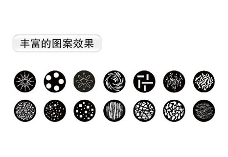1個(gè)旋轉(zhuǎn)圖案盤(pán):18個(gè)可換圖案片,可安裝玻璃圖案片和金屬圖案片,可雙向變速旋轉(zhuǎn),具有索引功能,變速抖動(dòng)效果、雙向變速流動(dòng)效果