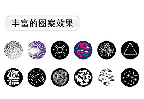 1個(gè)固定圖案盤,1個(gè)旋轉(zhuǎn)圖案盤,16個(gè)可更換圖案片(可選配),可安裝玻璃圖案片和金屬圖案片 可雙向變速旋轉(zhuǎn),具有索引功能,變速抖動(dòng)效果、雙向變速流動(dòng)效果