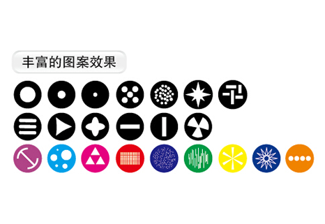 1個旋轉(zhuǎn)圖案盤:9個自轉(zhuǎn)圖案+白光,具有變速抖動效果、雙向變速流動效果,自轉(zhuǎn)圖案片可換。圖案片外形直徑Ф15.9mm,圖案有效直徑Ф13mm