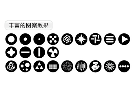 1個(gè)旋轉(zhuǎn)圖案盤:9個(gè)自轉(zhuǎn)圖案+白光,具有變速抖動(dòng)效果、雙向變速流動(dòng)效果,自轉(zhuǎn)圖案片可換。圖案片外形直徑Ф15.9mm,圖案有效直徑Ф13mm