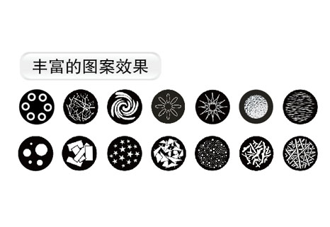 1個(gè)固定圖案盤,1個(gè)旋轉(zhuǎn)圖案盤,14個(gè)可更換圖案片(可選配),具有變速抖動(dòng)效果、雙向變速流動(dòng)效果