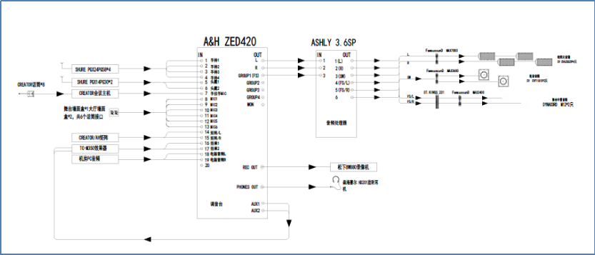 方案的擴(kuò)聲系統(tǒng)主要由:專業(yè)音箱、專業(yè)功放、調(diào)音臺(tái)、音頻處理器、音源設(shè)備等組成,但房間主要體現(xiàn)一個(gè)是多功能,因此擴(kuò)聲系統(tǒng)中增加了兩只超低音箱,滿足文娛活動(dòng)大動(dòng)態(tài)需求。