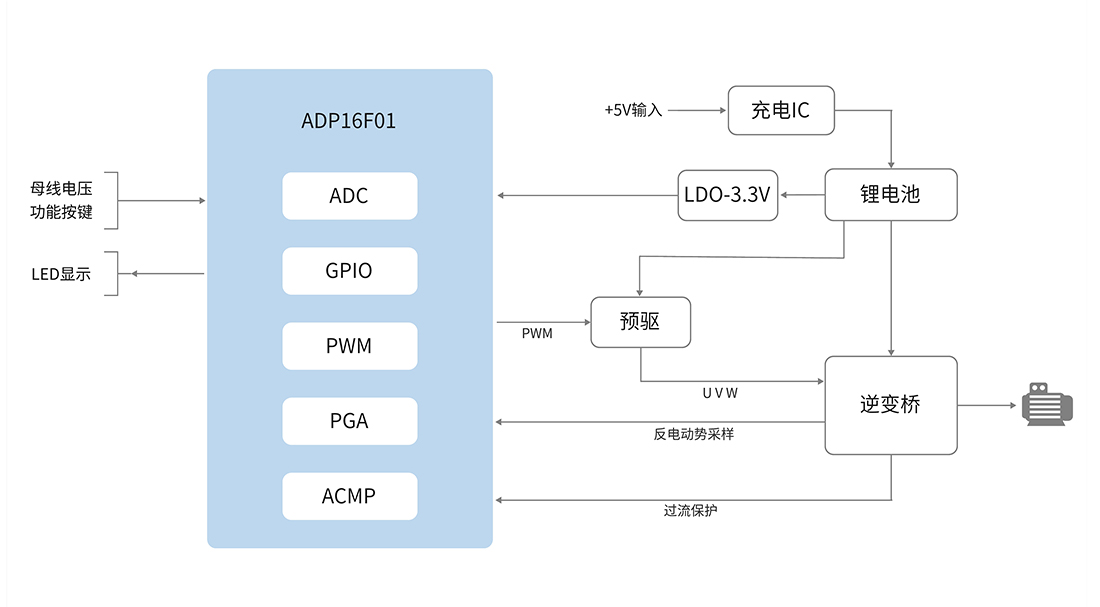 本方案是基于進芯16位DSP ADP16F01開發(fā)的,充分發(fā)揮了ADP16F01的算力、資源、成本等優(yōu)勢。整個系統(tǒng)結(jié)構(gòu)簡單,采用無感方波控制算法,能夠?qū)崿F(xiàn)筋膜槍的穩(wěn)定啟動和運行,通過設(shè)置不同的限流點可以實現(xiàn)對的力道大小的調(diào)節(jié);擁有堵轉(zhuǎn)卸力,快速充電,動力強勁等功能。