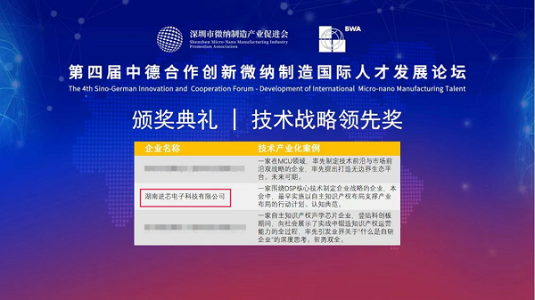 1月6日,由深圳市微納制造產(chǎn)業(yè)促進會、德國聯(lián)邦經(jīng)濟發(fā)展和對外貿(mào)易聯(lián)合總會(BWA)聯(lián)合主辦,西麗湖人才服務(wù)中心承辦的“第四屆中德合作創(chuàng)新微納制造國際人才發(fā)展論壇”于深圳順利舉行,論壇圍繞微納制造技術(shù)產(chǎn)業(yè)化、國際合作、科創(chuàng)人才發(fā)展等話題進行了演講和探討。在“微納制造技術(shù)產(chǎn)業(yè)化優(yōu)秀案例評選”中,進芯電子榮獲“技術(shù)戰(zhàn)略領(lǐng)先獎”