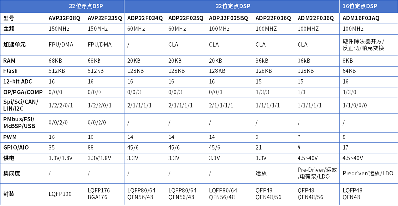 針對(duì)以上需求,進(jìn)芯電子經(jīng)過多年深耕,推出了符合IATF16949,AEC-Q100 Grade1標(biāo)準(zhǔn)的強(qiáng)大產(chǎn)品陣容,包括:32位浮點(diǎn)高性能DSP芯片AVP32F335系列,32位定點(diǎn)實(shí)時(shí)控制DSP芯片ADP32F034、ADP32F035系列,32位定點(diǎn)車身控制DSP芯片ADP32F036、ADM32F036系列, 16位定點(diǎn)高性價(jià)比DSP芯片ADM16F03系列;全面匹配電動(dòng)汽車從動(dòng)力域到車身域的多種應(yīng)用。進(jìn)芯產(chǎn)品憑借其優(yōu)異性能獲得OEM廠商的認(rèn)可,已實(shí)現(xiàn)商用量產(chǎn),并提供長期供貨保證。