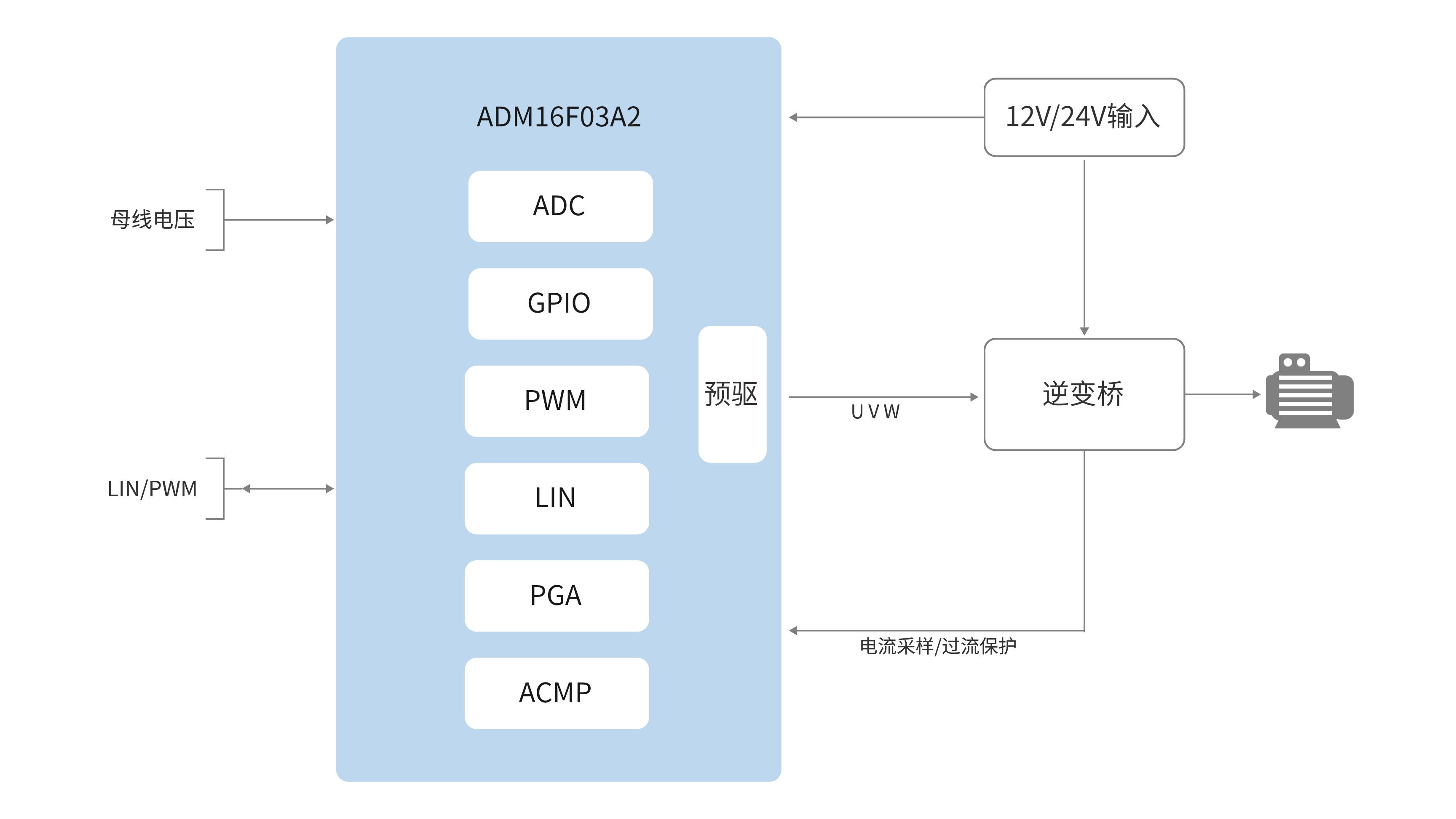 該方案采用自研無感單電阻FOC算法,具備母線電壓ADC檢測(cè),可通過PWM/LIN進(jìn)行控制不同的轉(zhuǎn)速及故障反饋功能;具有順逆風(fēng)啟動(dòng),噪聲小,波形控制穩(wěn)定等特點(diǎn)